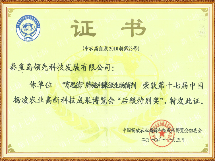 “富思德”牌施利康微生物菌劑—第十七屆中國楊凌農博會“后稷特別獎”