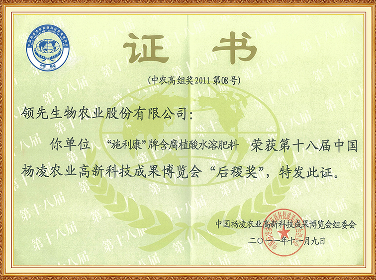 施利康牌含腐植酸水溶肥料—第十八屆中國(guó)楊凌農(nóng)博會(huì)“后稷獎(jiǎng)”